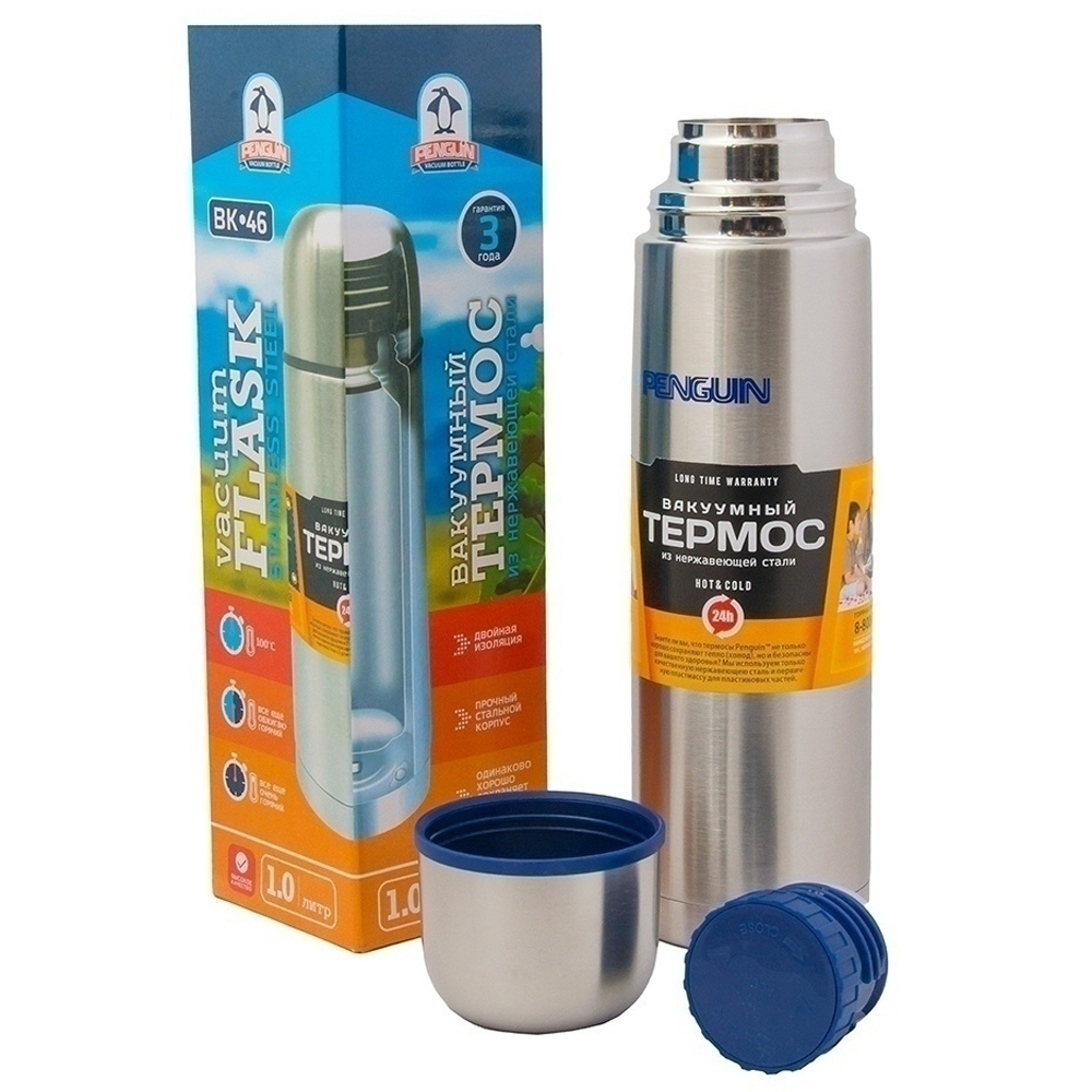 Термос Пингвин BK-46 из нержавеющей стали с глухой пробкой лишит вас некоторого удобства, предоставляемого пробкой с кнопкой, но зато можно получить дополнительные 1-2 градуса за счет снижения теплопотерь через пробку и не нужно беспокоиться о качестве пробки, т. к. глухая пробка абсолютно надежная. В ней по просто нечему ломаться. Объем термоса в 1.0 литр обеспечит длительное сохранение тепла. Термос имеет отличные температурные характеристики. Температура через 24 часа не менее 55-60 С, это один самых высоких показателей на рынке. Такие высокие температурные данные обеспечиваются современными технологиями создания глубокого вакуума, нанесением специального отражающего покрытий Cu-Ni на внутреннюю сторону колбы. Термос изготовлен из первоклассной нержавеющей стали. Все пластмассовые части сделаны из первичной пластмассы, не имеющей истории переработки. Всё это обеспечивает высокий уровень экологической чистоты изделия. Не зря ТМ Penguin имеет несколько специальных наград за высокий уровень экологической безопасности выпускаемой продукции.