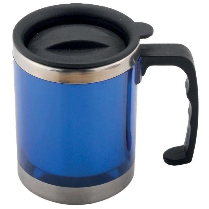 Термос-кружка объемом 300мл с внутренней стенкой из нержавеющей стали, снаружи декорирована цветным пластиком, с черной пластиковой ручкой и укомплектована пластиковой крышкой.