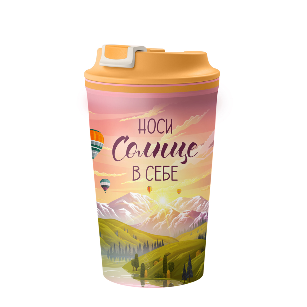 Термостакан с клапаном и декором Phibo Солнце 350 мл, розовый 433282205 состоит из двух пластиковых колб: внутренней и внешней.
