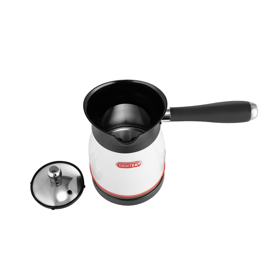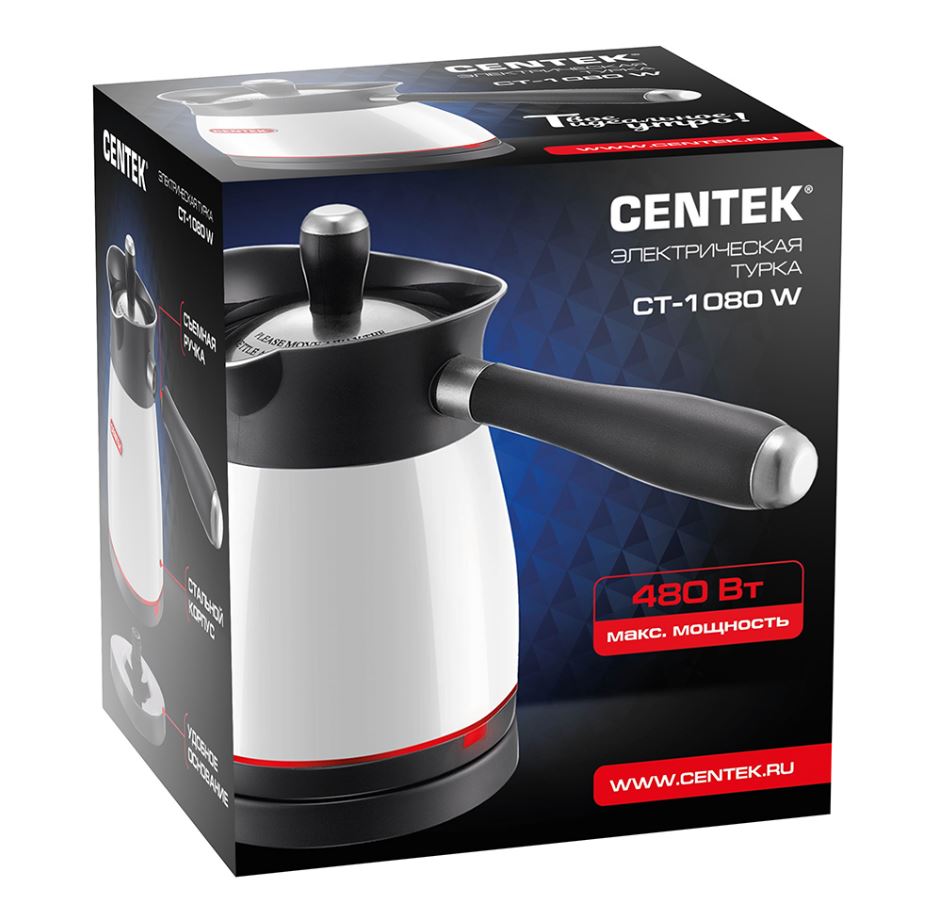 Электрическая турка Centek СТ-1080 – стильное и современное решение на вашей кухне. Фактурный корпус выполнен из высококачественного пластика и нержавеющей стали – не подвергается коррозии, не влияет на вкусовые качества воды и легко очищается от загрязнений. Нагревательный элемент скрытого типа обеспечит надежную и комфортную эксплуатацию прибора и быстрое закипание воды. Удобная форма сливного носика для аккуратного переливания содержимого. Шкала уровня воды. Объем емкости – 500 мл. За один раз можно приготовить 2 чашки кофе. Высокая мощность – 480 Вт. Вскипятить 0.5 литра воды можно за считанные минуты. Турку можно использовать и для быстрого подогрева небольшого объема воды.