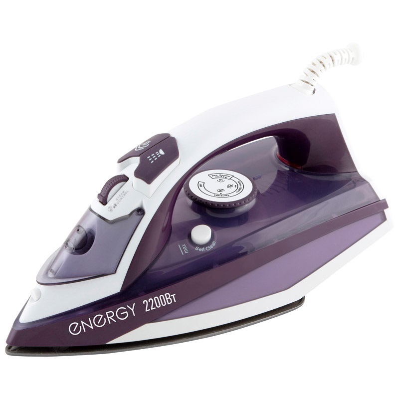 Мощность 2200 Вт. Индикатор нагрева. Сухая глажка. Пар и паровой удар. Вертикальный пар. Спрей. Указатель максимального уровня воды. Плавная регулировка температуры.