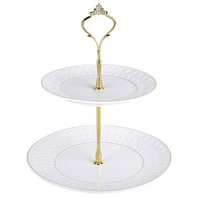 Двухъярусная фруктовница поможет в украшении фуршета или кухни. Подойдет для сервировки закусок, овощей, орехов, фруктов, пирожных, капкейков, конфет и других десертов и сладостей. Тарелки выполнены из высококачественного белого фарфора и украшены декоративными рельефными узорами. Диаметры блюд 16,5 см и 21 см. Держатель выполнен из металла. Многоярусная подставка не подходит для ПММ. Кухонная фарфоровая этажерка из серии посуды "Династия" сможет стать настоящим украшением интерьера или приятным подарком для ваших родных и близких!