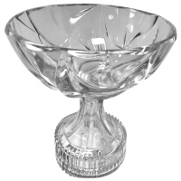 Стеклянная ваза на ножке, глубокая, прозрачная с рельефным рисунком узором.