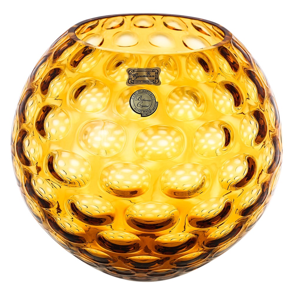 Желтая ваза для цветов "Амбер соты" 20 см изготовлена из цветного стекла. Ваза имеет круглые рельефные выемки по всей своей поверхности. Благодаря такому рисунку ваза напоминает медовые соты.