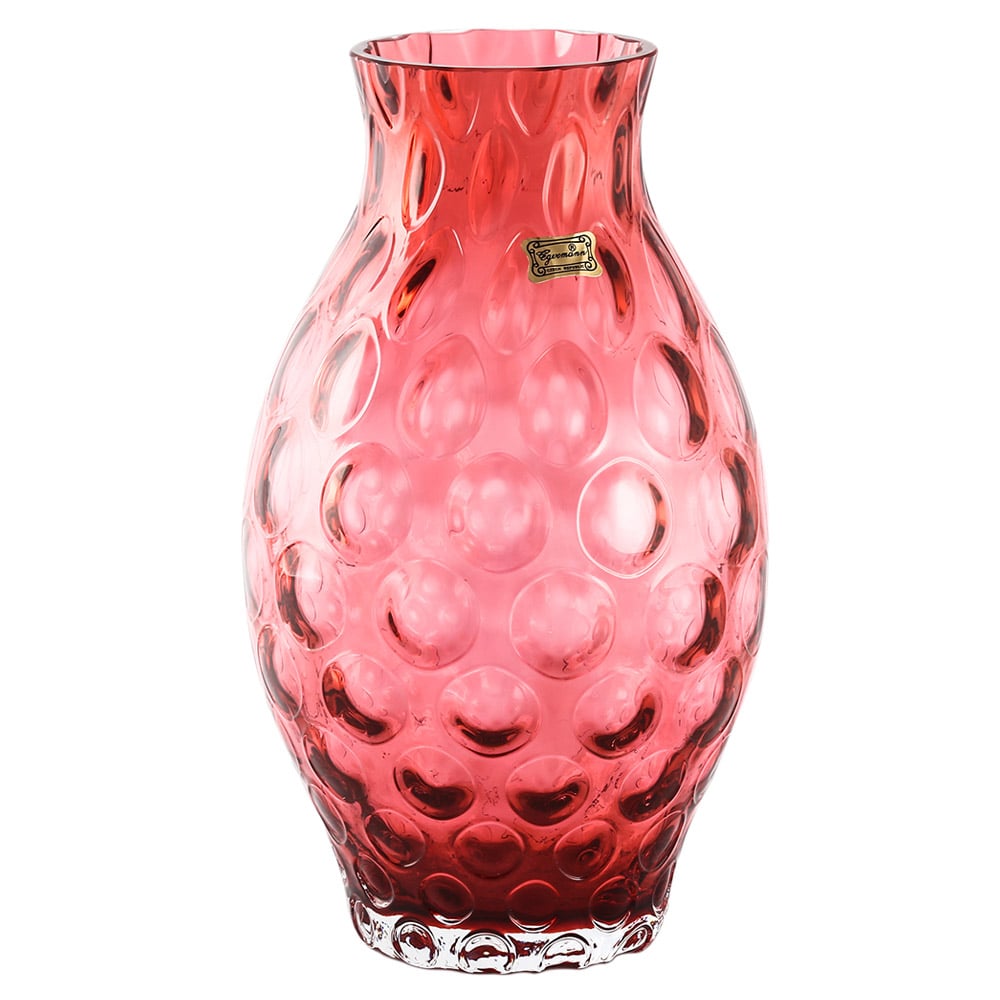 Розовая ваза для цветов "Розовые соты" 25 см изготовлена из розового стекла. Ваза имеет круглые рельефные выемки по всей своей поверхности. Благодаря такому рисунку ваза напоминает медовые соты.
