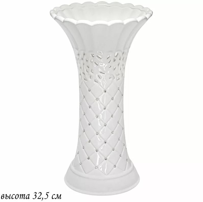Ваза для цветов изготовлена из керамики, покрыта белой глазурью и декорирована стразами.