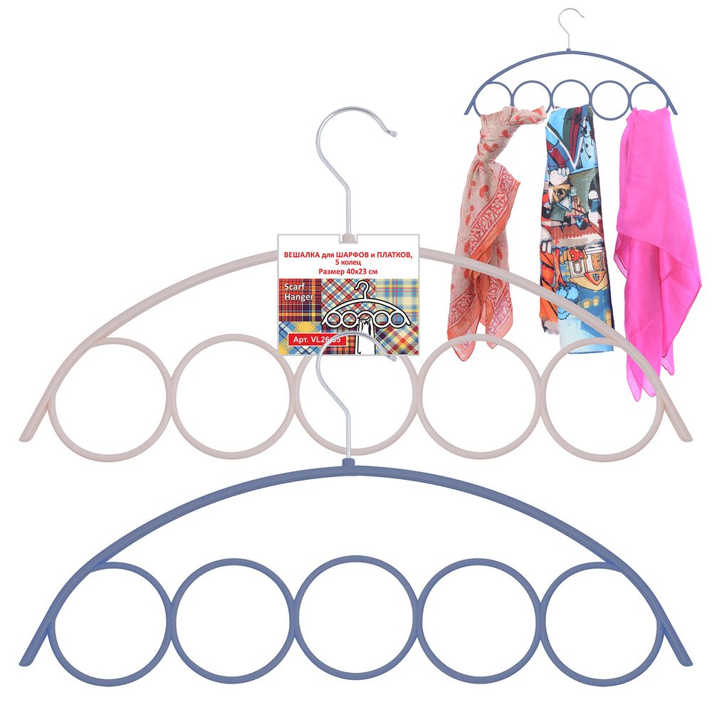 Пользоваться очень просто: аккуратно проденьте в кольцо шарф, ремень или другой предмет и повесьте вешалку в шкаф. Изделие имеет 5 колец, навешивается на обычную перекладину в шкафу. Изготовлено из пластмассы (полипропилен).