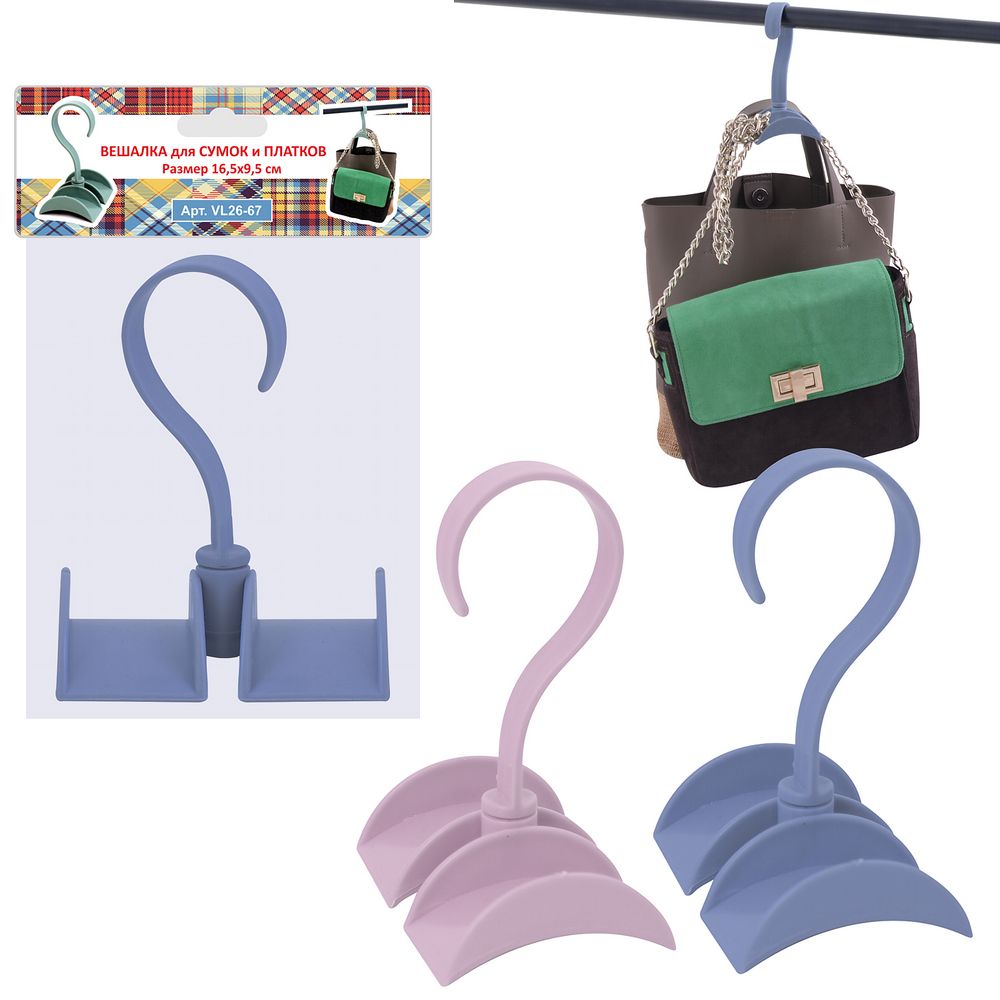 На вешалке есть две перекладины, на которые можно поместить по одной ручке большой объёмной сумки или две сумки небольшого размера. Конструкция также подходит для хранения платков и шарфов. Изделие навешивается на любую перекладину в шкафу.