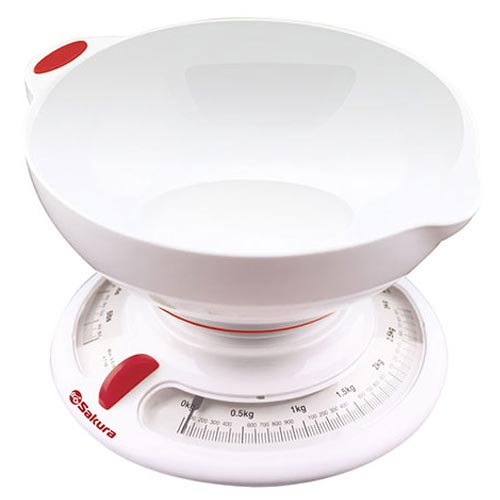 Механические весы, нагрузка 3 кг, цена деления 25 г, пластик.чаша, емкость чаши 1200 мл, единицы измерения: гр/унции, цвет корпуса: белый/красный