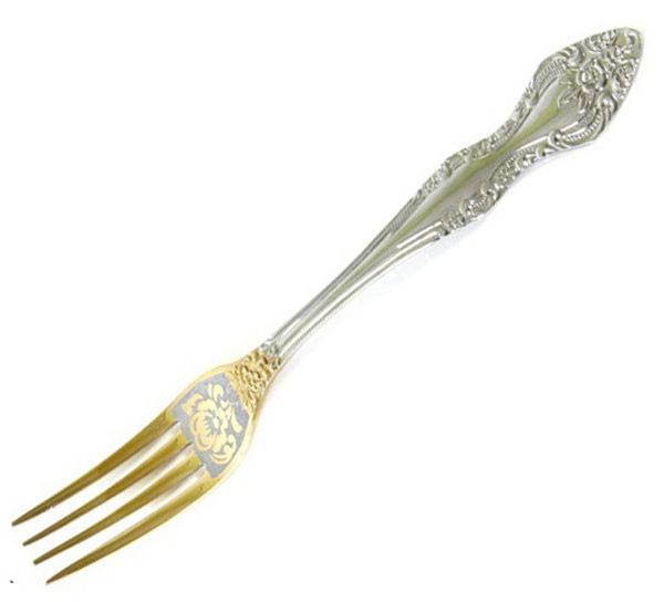 Декоративные ручки столовых приборов выполнены методом штампованной чеканки, что говорит об уникальности производства, поскольку сталь, в отличие от мельхиора, сложно поддается каким - либо видам деформации.
