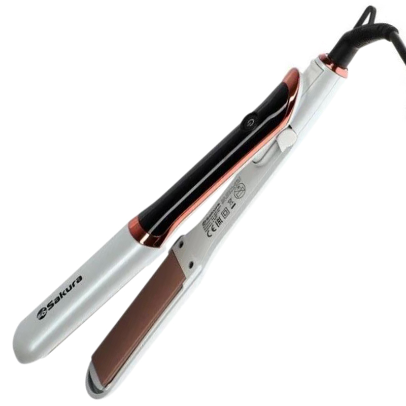 Выпрямитель Sakura Premium мощностью 50Вт, ультра гладкие (GP) керамические плавающие пластины 95х32мм, LED, максимальная температура 230ºС, регулировка температуры (150-230ºС), автоотключение, блокировка полотен, цвет корпуса белый.