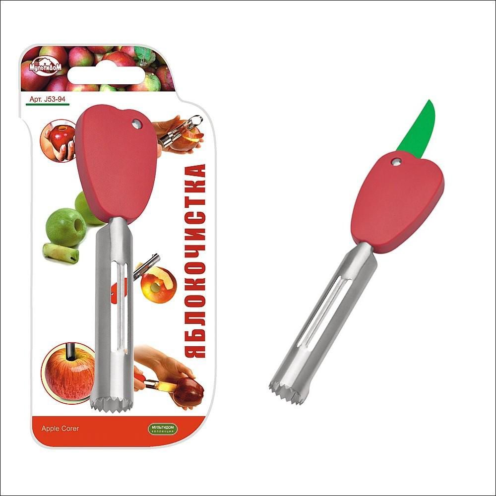 Удобный инструмент для очистки и нарезки яблок, а также других сходных по размеру овощей и фруктов.