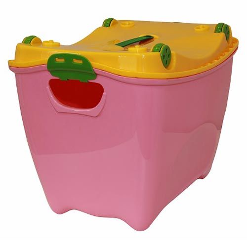 Ящик «Супер-пупер» — беспроигрышный вариант для детской комнаты. Модель лёгкая и мобильная, с ней можно не только навести идеальный порядок, но и развлечься. Как? Закройте ящик крышкой с помощью специальных фиксаторов и переверните его колёсиками вниз — теперь это настоящая каталка! Кроха может ездить на ней сам, отталкиваясь ножками, или возить свои игрушки.