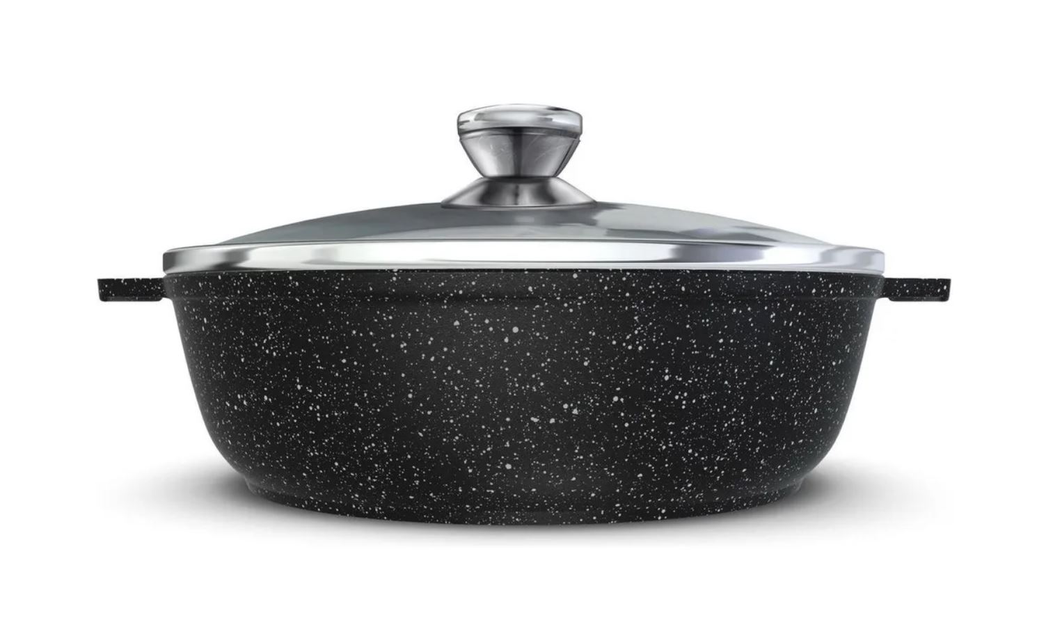 Жаровня НМП Индукция Гранит со стеклянной крышкой - это разновидность глубокой сковороды, имеющая две цельнолитые ручки. Корпус жаровни изготовлен из алюминия методом литья с кристаллизацией под давлением, такой корпус не подвержен деформации и обеспечивает равномерный нагрев.Также жаровню отличает большой диаметр рабочей поверхности, толстые стенки и утолщенное дно.