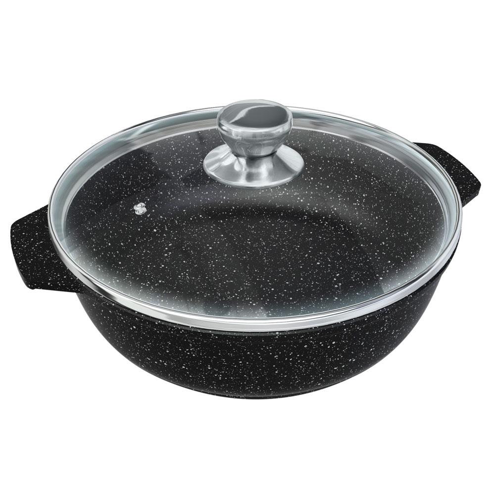 Жаровня – это разновидность глубокой сковороды, имеющая две цельнолитые ручки. Корпус жаровни изготовлен из алюминия методом литья с кристаллизацией под давлением, такой корпус не подвержен деформации и обеспечивает равномерный нагрев.