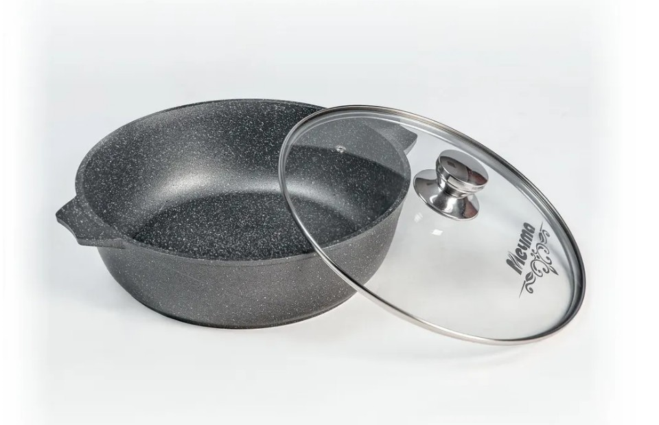 Жаровня Гранит — это специальный вид посуды для приготовления мяса, рыбы, птицы и овощей. Но именно в ней, в отличие от сковородок и противней, ваши любимые мясные блюда получатся очень нежными с хрустящей корочкой. В комплекте с жаровней Гранит идет стеклянная крышка, так как под крышкой продукты более равномерно пропекаются, и она препятствует чрезмерному испарению жидкости. Кастрюля - жаровня гранит из литого высококачественного пищевого алюминия "Мечта" станет незаменимым инструментом и надежным помощником на вашей кухне. Серия Гранит — это литая алюминиевая посуда с антипригарным покрытием повышенной стойкости, с содержанием частиц твердых минералов.