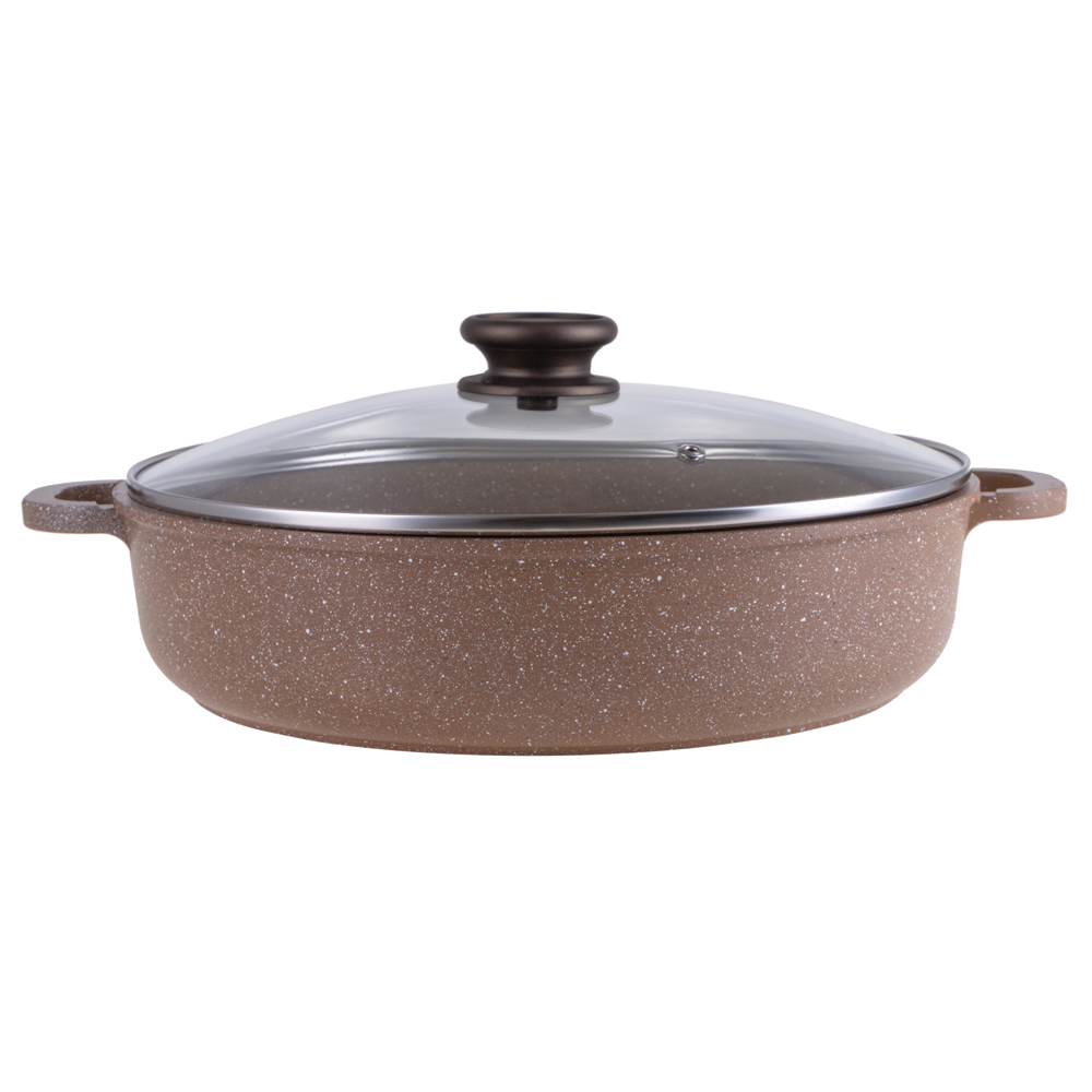 Жаровня Hitt Maroon 30 см изготовлена из литого алюминия методом ручного литья. Обладает прекрасными техническими характеристиками: толщина дна 5 мм, толщина стенок 3,5 мм, высокий борт, отличное двухслойное антипригарное покрытие немецкой марки Greblon C2+. Рекомендуется для ежедневного интенсивного использования. Характеризуется повышенной износостойкостью. Толстые стенки и дно жаровни удерживают температуру нагрева.